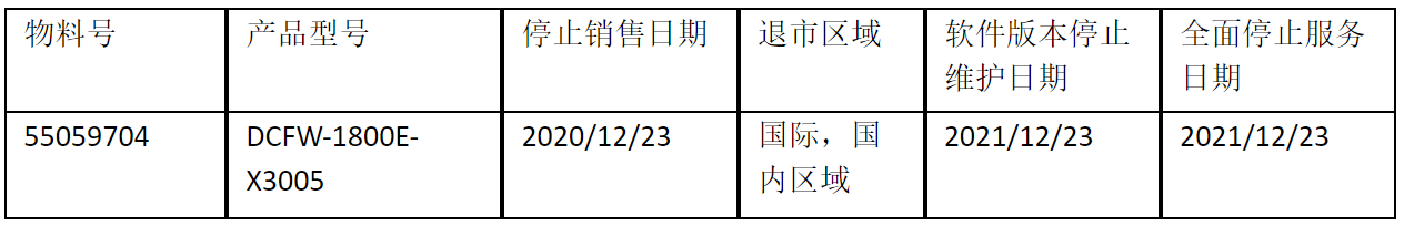 北京神州数码大满贯PG信息技术有限公司正式通知您, 以上DCFW-1800E-X3005下一代防火墙(55059704)将于2020年12月23号停止接收新的订单(具体日期见上表),不再供货。给您带来的不便,敬请原谅。