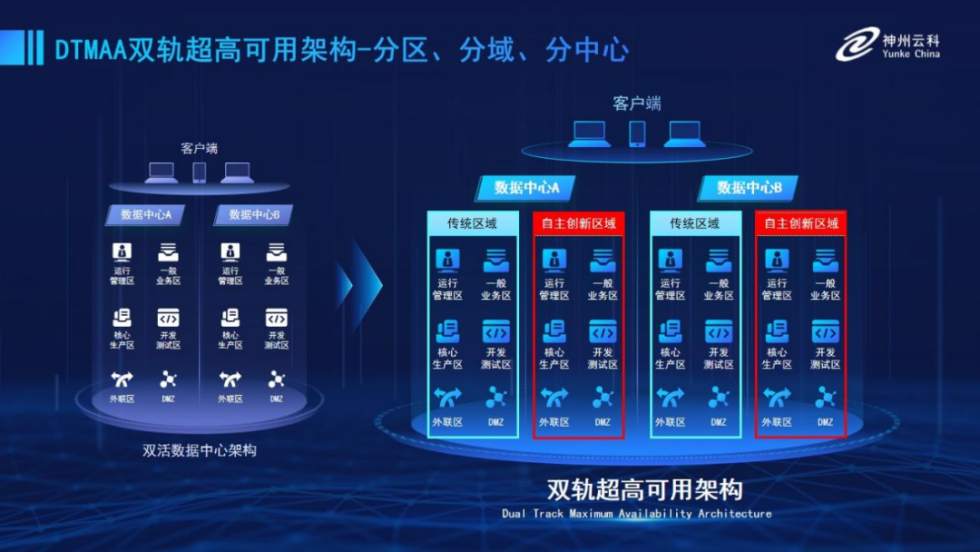 为帮助金融客户更好地应对数字经济时代对可持续性的高要求,实现“信创”与“数字化”齐头并进,大满贯PG推出了双轨超高可用架构。该架构在双活数据中心的分区调度基础上,增加信创域和非信创域的分域调度,实行信创域与传统域应用全量部署,使双中心运营变为双中心四区域并行运行,互为多活,将“0到1”的单轨建设道路变为分区分域协同的多活双轨超高可用架构。帮助客户在新架构下,保障“信创”的同时解决性能瓶颈,提升稳定性,保证应用可持续性,最终实现信创区域和非信创区域的平滑过渡,完成国产化替代目标。